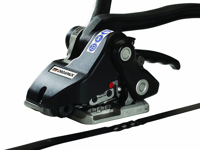 · 免用鐵扣,采用三點(diǎn)上下沖模咬合,利用上下沖模機(jī)構(gòu)將鋼帶打出三個(gè)陰陽(yáng)扣互相咬合,抗斷裂強(qiáng)度可達(dá)85%,相較傳統(tǒng)鐵扣結(jié)合更加強(qiáng)韌。